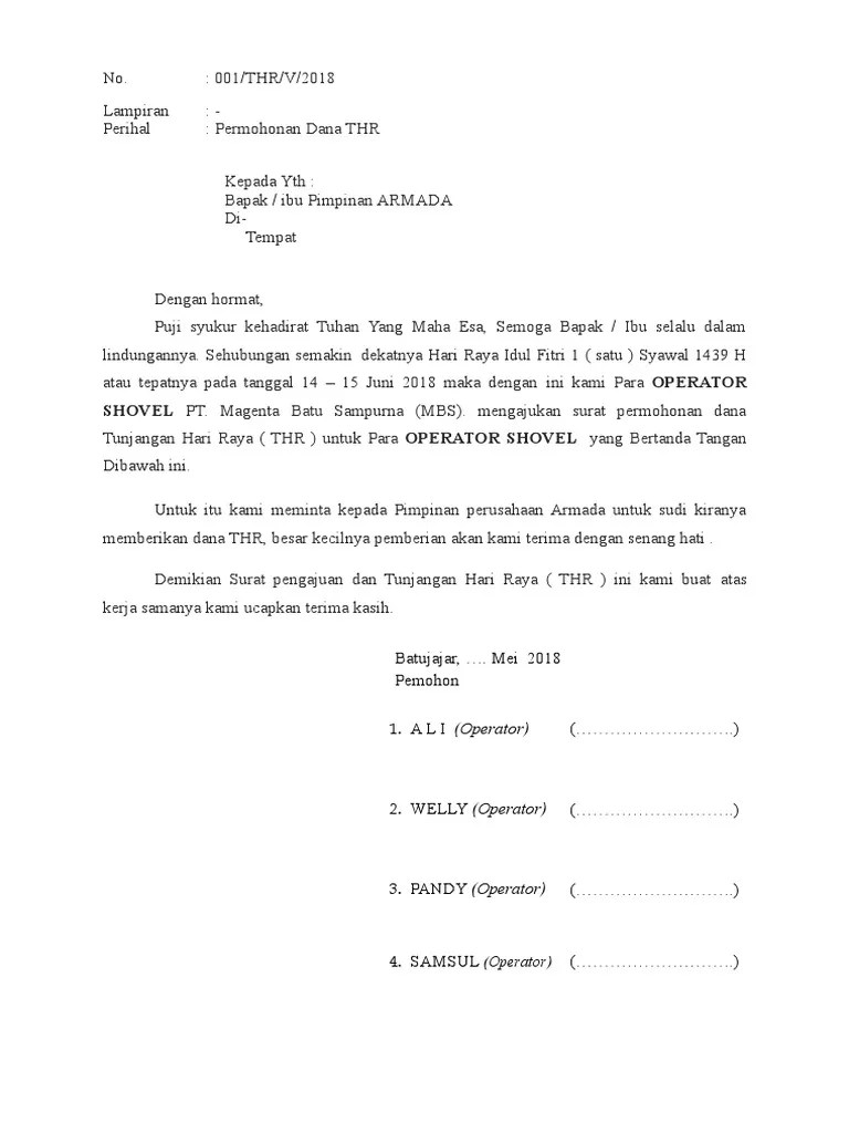 Tantiem adalah bagian keuntungan perusahaan yang dihadiahkan kepada karyawan, yang baru. Permintaan thr dengan surat resmi oleh pegawai kelurahan. Demikian surat permohonan bantuan thr ini kami ajukan untuk diperhatikan, dan kami siap membantu demi terciptanya suasana keamanan dan . Diketahui pada akhir mei 2018 beredar surat permohonan thr yang diduga. Dari pengusaha itu pasti ada perusahaan asing atau pma, malu kita kalau sampai .